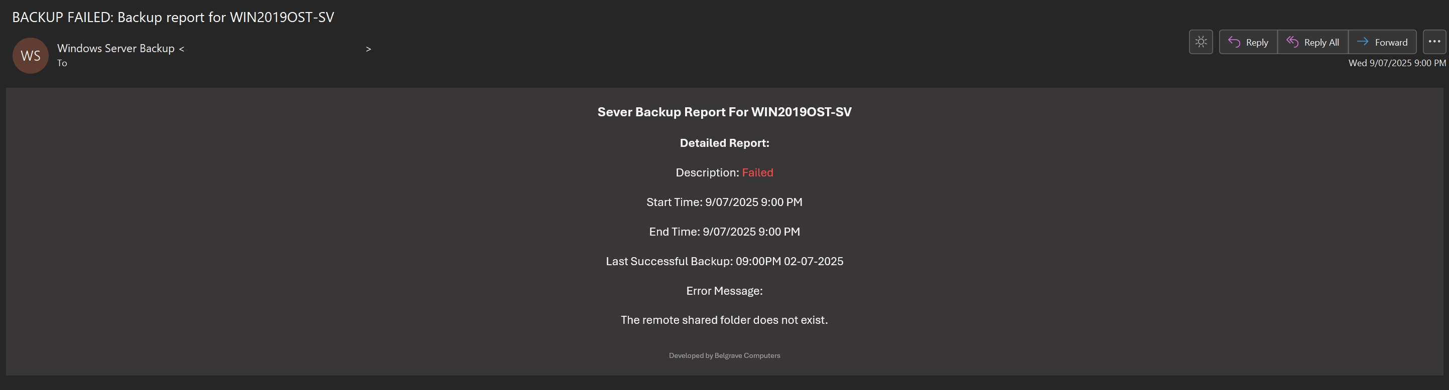 A preview of an email notification - this is an error notification.